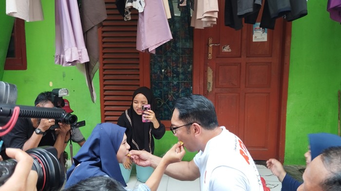 Calon Gubernur (Cagub) Jakarta, Ridwan Kamil atau RK, tiba-tiba berhenti dan ikut ngerujak di teras rumah warga saat menuju Pasar Muara Angke, Jakarta Utara. RK lalu menyuapi warga buah mangga yang dipotongnya.