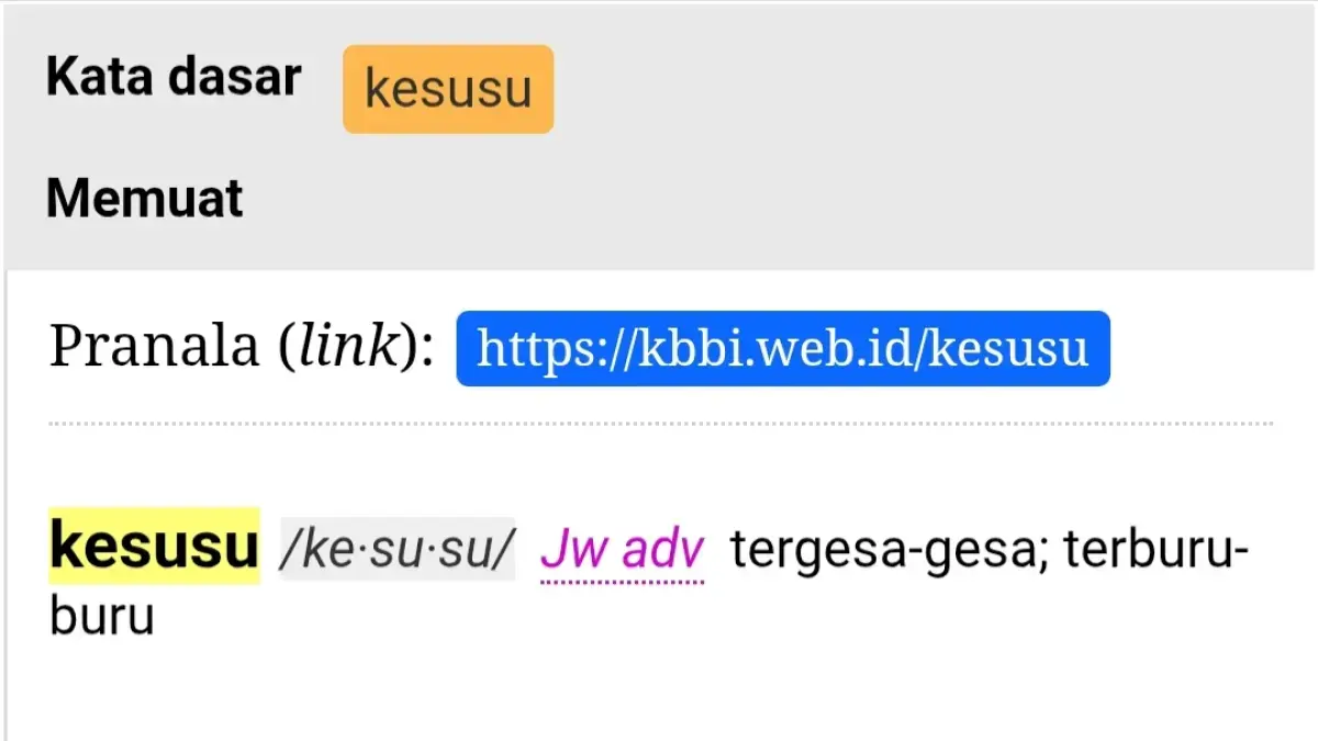 Menurut KBBI, “kesusu” digunakan untuk menggambarkan seseorang yang bertindak cepat tanpa memikirkan konsekuensi atau persiapan matang terlebih dahulu.